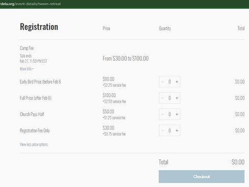 If you attend an affiliated Church of the Brethren (see list at www.campmardela.org/about) our church scholarship fund will cover half of the full-price amount!